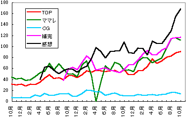 まとめたら、おもしろいことに、感想にっきは4月と10月にちょっとアクセスが伸びることがわかりました。番組改変期ですね。先月の伸びはそれでもまだ異常ですけど。