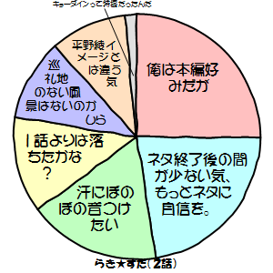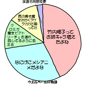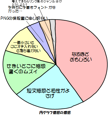 短文感想とは相性がいい気。それぞれの要素を繋げる接続詞が要らない分スマートに収まるね。でも表内に短文をに収める難しさがあるし、一番パーセンテージが低いとこにオチを入れるセンスが結構大変だと思う。それに情報量の割に画像にしてしまうことになるので、容量食うよね。JavaScriptで描画するやつとかもあるみたいだけど。って、こういうのこそべつやくメソッドなのか。