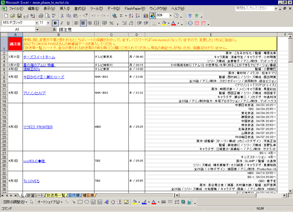 1.MOON PHASEさんの番組表を左端のシートに貼る。 (抽出が必要な時期の部分のみコピペしてください。放送日が確定していないところの動きはいまいちちゃんとしていません) ※クリックで原寸表示