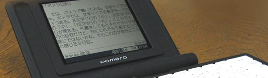 なんか世間ではケースがどうとか、保護フィルムがどうとかの話題がありますが、自分のポメラはむき出しでカバンに放り込んでいます。保護フィルムも貼っていません。自分としては「ポメラは雑に扱う」と決めたからです。文具並の強度があるらしいし、2色液晶でホコリとか別に気にしなくても読めないほどの汚れにはならんだろうし。別に無茶苦茶高いものというほどでもないし。メモ帳として、すっと出してすっと使って、さっとしまう、そんなイメージ。もう少し小さければ&軽ければポケットに放り込むことも考えましたけどね。机がないと使いにくいので、ポケットから出すものでもないだろういうこともあって、カバン行き。