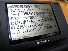 →どこかのレビュー記事では変換候補の一覧表示時に数字キーを押しても、その候補を選べないと書いてあったけど、手持ちのこのポメラだとちゃんとそれになるね…。ファームウェアのバージョンアップで直したのかしら。自分としては「PageDown」「PageUp」で変換候補一覧を前後できないのが地味に気になる。「無変換/変換」「Shift+無変換/変換」で同様の機能ではあるんだけど。