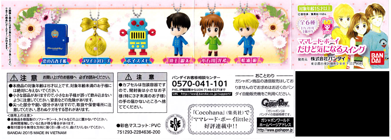 今月(2015年1月)中旬より、ママレード・ボーイのガシャポン「ママレード・ボーイ だけど気になるスイング」が稼働中です。1回200円、全6種(「小石川光希」「松浦遊」「須王銀太」「ボイスメモ」「メダイユブローチ」「恋の青春手帳」)。設置店などは公式ページを参照のこと。