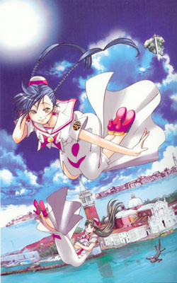 ARIA The ANIMATIONのDVD-BOX(というかBOX仕様の箱)のジャケットはこの落下シリーズになっています(裏表はキャラが違うけど、背景構図は一緒)。資料キャプは色味がきれいだった裏面の姫屋仕様にしておきました(表はARIAカンパニーの面々)。